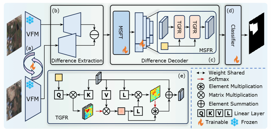 遥感变化检测通过双时相图像监测地表动态,在灾害响应、生态保护和土地管理等领域应用广泛。但现有方法难以应对跨平台、季节光照及突发事件带来的域偏移,泛化能力不足成为落地瓶颈。