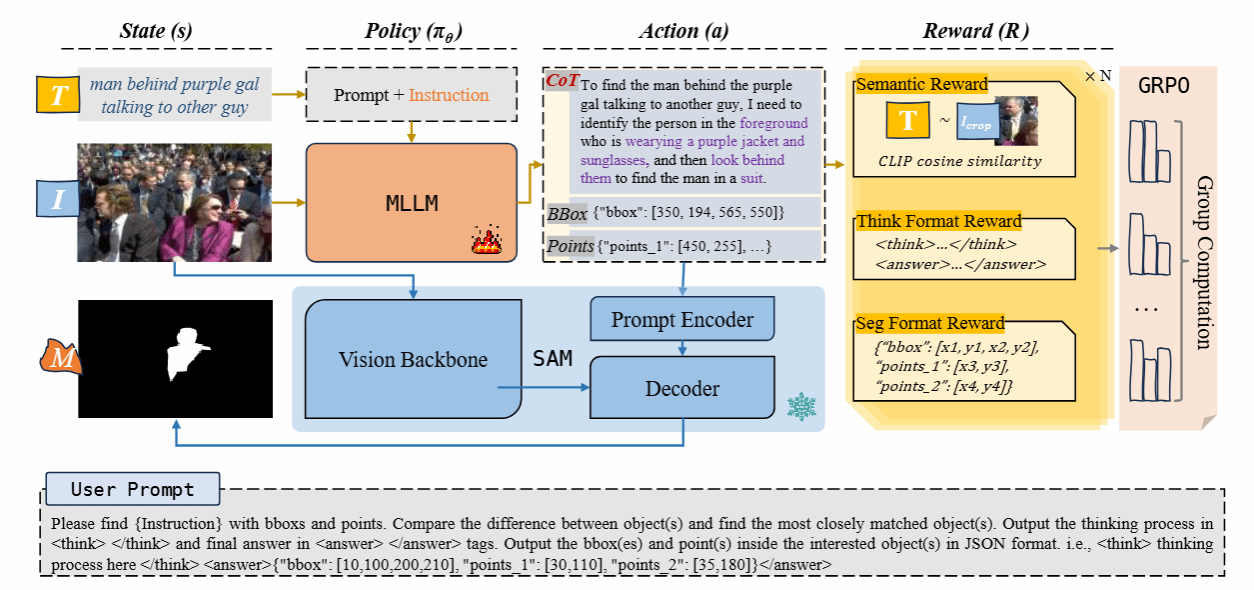 指令引导分割根据自然语言指令生成目标像素级掩码,在人机交互和智能机器人等领域具有广泛应用价值。然而,现有方法依赖昂贵几何标注,且难以监督复杂空间关系与世界知识的组合推理,限制了大模型在开放场景下的能力。