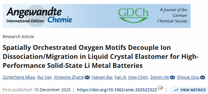 近日,西北工业大学苗宗成教授与合作者创新性地提出并构筑了一种空间图案化氧基团的液晶弹性体电解质,通过独特的“锚定-中继”机制,成功解耦了锂盐解离与离子迁移这两个长期矛盾的过程,实现了室温下优异的综合性能。相关论文以“Spatially Orchestrated Oxygen Motifs Decouple Ion Dissociation/Migration in Liquid Crystal Elastomer for High- Performance Solid-State Li Metal Batteries”为题,发表在化学领域国际顶级期刊《Angewandte Chemie International Edition》上。西北工业大学光电与智能研究院苗宗成教授与其硕士研究生严瑞为论文共同第一作者,上海理工大学窦世学院士和西京学院贺泽民教授、张星星副教授为论文共同通讯作者。