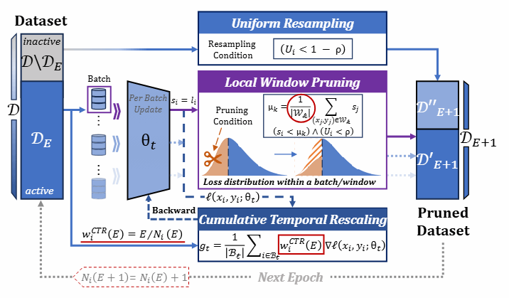 针对深度学习模型在海量数据训练中面临的高昂计算成本问题,本研究创新性地提出了RePB(Resolving Pruning Biases)框架,旨在通过科学的数据选择实现训练加速。该框架系统性地解决了动态数据剪枝中长期存在的两大一致性难题:一是通过局部窗口剪枝(Local Window Pruning, LWP)机制,在模型状态相对稳定的短周期内进行重要性评分对比,有效克服了因参数漂移导致的“评分背景漂移”;二是结合累积时间重标定(Cumulative Temporal Rescaling, CTR)技术,根据样本的历史选择频率动态调整梯度权重,从理论和实践层面纠正了“时间梯度偏差”,确保了剪枝后的训练轨迹与全量数据训练保持一致。